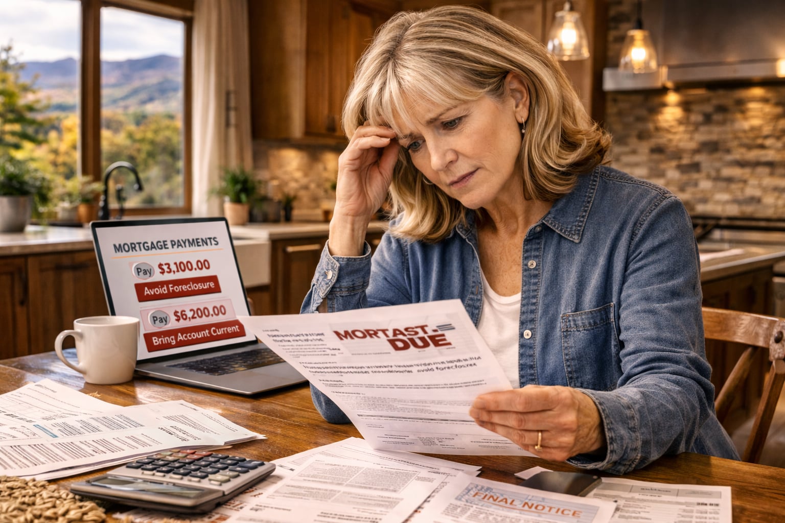 Waynesville NC homeowner reviewing mortgage payments to avoid foreclosure